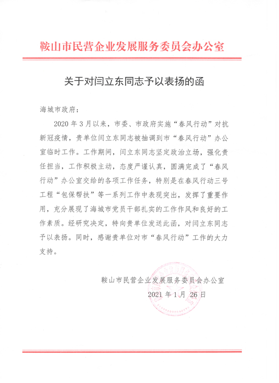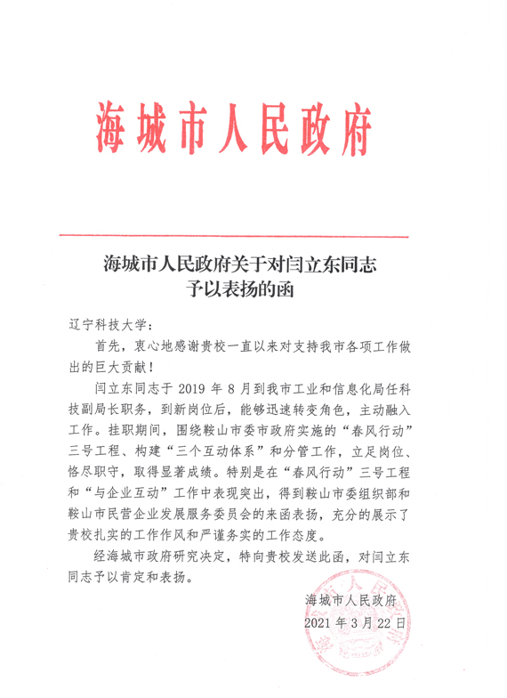 2021年1月,鞍山市民营企业发展服务委员会办公室向海城市政府送发了《关于对闫立东同志予以表扬的函》;2021年3月,海城市人民城府向乐动在线下载(中国)送发了《海城市人民政府关于对闫立东同志予以表扬的函》,对闫立东同志坚定政治立场、强化责任担当,积极主动完成鞍山市的各项重点工作任务予以表扬;对科大教职工在各项工作中表现出的扎实工作作风和严谨务实的工作态度予以肯定。校党委对闫立东同志能够站在学校与地方共谋振兴发展大局的高度,敢于担当,勇于奉献,积极作为,取得了较好的工作成绩表示肯定,并号召广大选派干部向闫立东同志学习,提高站位、增强意识、珍惜机会、主动作为,在推动辽宁全面振兴、全方位振兴的广阔天地里锻炼成长。