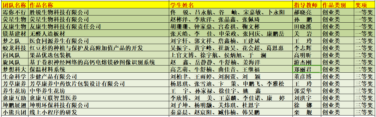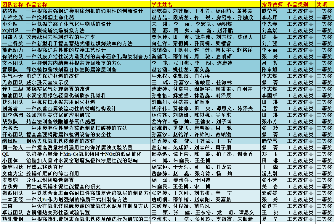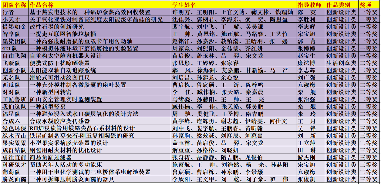 自2月22日启动以来,大赛得到了广大教师和本科生以及硕、博士研究生的支持与鼓励,共收到来自材冶、土木、电信、化工、管理、矿业、机械、经法、建艺、国际、计软11个学院的参赛作品百余件。经组委会初评、决赛答辩等环节,最终评选发明制作类奖项24项,其中一等奖7项、二等奖8项、三等奖9项;工艺改进类奖项33项,其中一等奖10项、二等奖11项、三等奖12项;创新设计类奖项24项,其中一等奖7项、二等奖8项(含生活创意类1项)、三等奖9项;创业类奖项15项,其中一等奖4项、二等奖5项、三等奖6项。