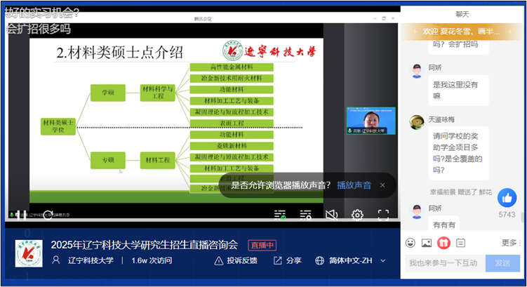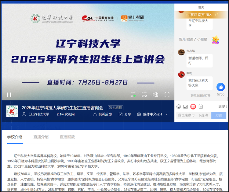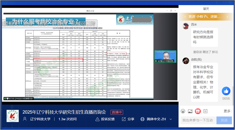 为做好研招直播宣讲,学院精心组建了宣讲团队。本次宣讲中,李万明和田琳教授详细介绍了冶金和材料学科的设置特色、师资力量、科研方向等,耐心解答了考生及家长关注的导师双选、考研准备、实验和住宿条件,以及就业前景等问题,帮助考生深入了解了材冶学院研究生培养情况和2025年研究生招生信息。