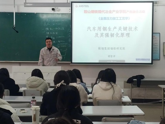 活动依托材料成型及控制工程专业核心课程《金属压力加工工艺学》,邀请鞍钢集团鞍山钢铁领军计划冷轧领域首席专家,鞍钢股份有限公司冷轧厂首席工程师,鞍山钢铁英才计划技术拔尖人才胡智评博士与课程负责人张大征副教授共同为材控2022级学生授课,专家胡智评博士讲授了具有鲜明鞍钢生产特色的“汽车用钢生产关键技术及其强韧化原理”。该部分授课内容向同学们展示了典型冷轧产品的应用需求、发展趋势、生产工艺流程、关键工艺技术及物理冶金学原理,实现了企业专家与高校师生的深度互动,打破了传统课堂与产业实践的壁垒,助力学生成长为适应现代冶金行业需求的高素质技术人才。