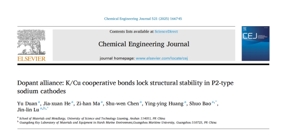 近日,乐动在线下载(中国)材料与冶金学院包硕副教授联合广州航海学院(广州交通大学筹)路金林教授,以乐动在线下载(中国)为第一署名单位,在国际知名期刊《Chemical Engineering Journal》(中科院1区top期刊,2025年影响因子:13.2)发表高水平研究论文《Dopant alliance: K/Cu cooperative bonds lock structural stability in P2-type sodium cathodes》(https://doi.org/10.1016/j.cej.2025.166745),第一作者为乐动在线下载(中国)2023级硕士研究生段玉。