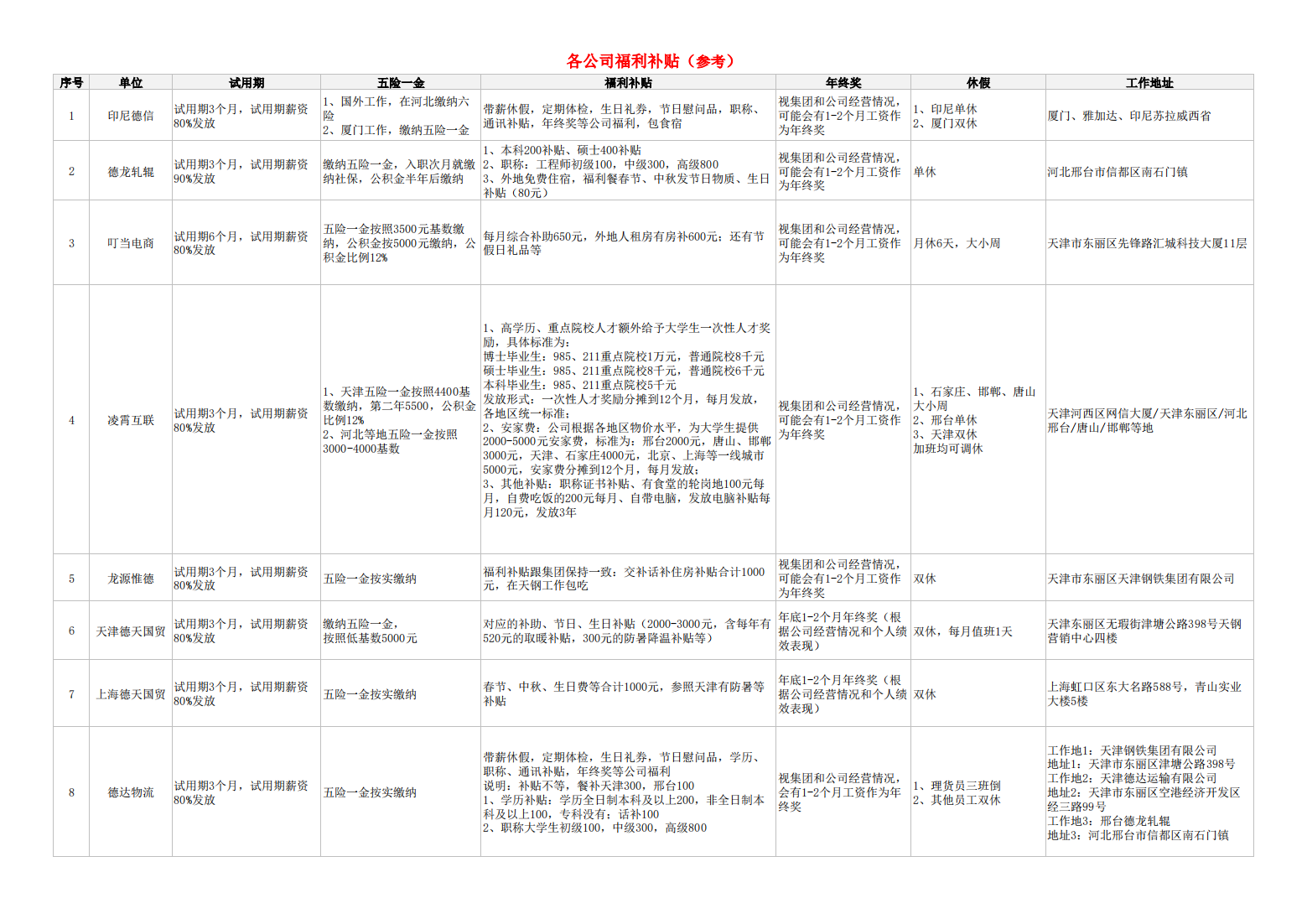 德隆集团各公司福利补贴政策