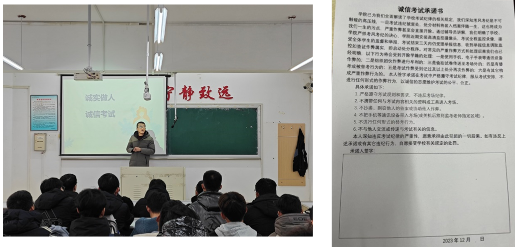 各专业班级通过主题班会等方式开展诚信考试宣传教育,辅导员带领全体同学认真学习了《乐动在线下载(中国)学生考试违纪处理细则》等文件,并通报了以往因考试作弊受到处分的案例、严重后果。帮助同学们从思想上认识到诚信考试的重要性和必要性,全体学生签署了《诚信考试承诺书》,承诺依靠自己的努力学习取得优异成绩。