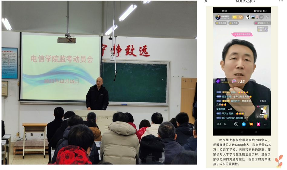 学院成立期末考试巡考领导小组。分别召开监考教师动员会与学生期末考试专题会,就期末考风考纪工作进行了部署。要求任课及监考教师应认真履责,严肃监考纪律;教育学生充分认识到端正考风、严肃考纪的重要性和必要性;辅导员召开主题班会,把抓考风促学风落到实处。同时学院通过抖音平台组织召开“家校携手,共育未来暨期末诚信考试教育”线上家长会,对大学生诚信考试及作弊被查处的后果等问题进行讲解,家校携手保证考风考纪。