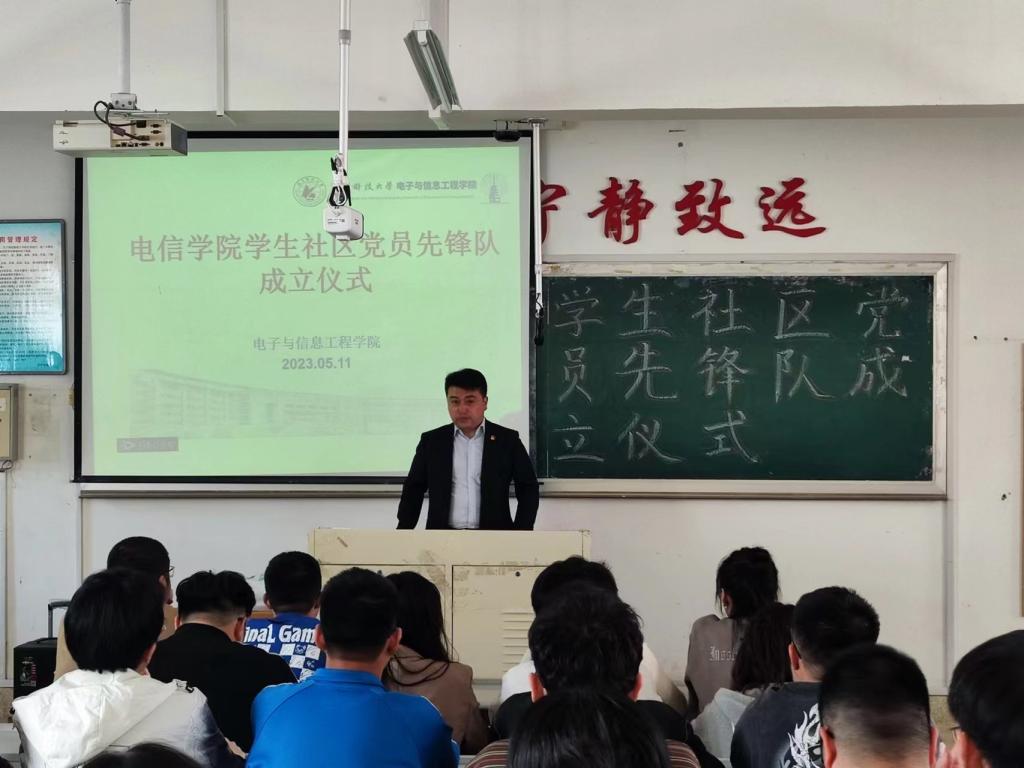 为深入学习贯彻习近平新时代中国特色社会主义思想,推进学院“一站式”学生社区综合管理模式建设工作,进一步发挥青年学生党员模范带头作用,引导广大青年学生党员在工作中当先锋、作表率,以实际行动践行初心使命。电信学院于5月11日在博闻楼九合举行学生社区党员先锋队成立仪式。活动由电信学院党委副书记由济恺主持,学院全体学生党员参加。