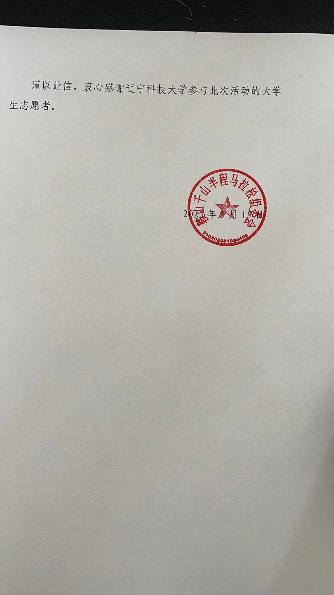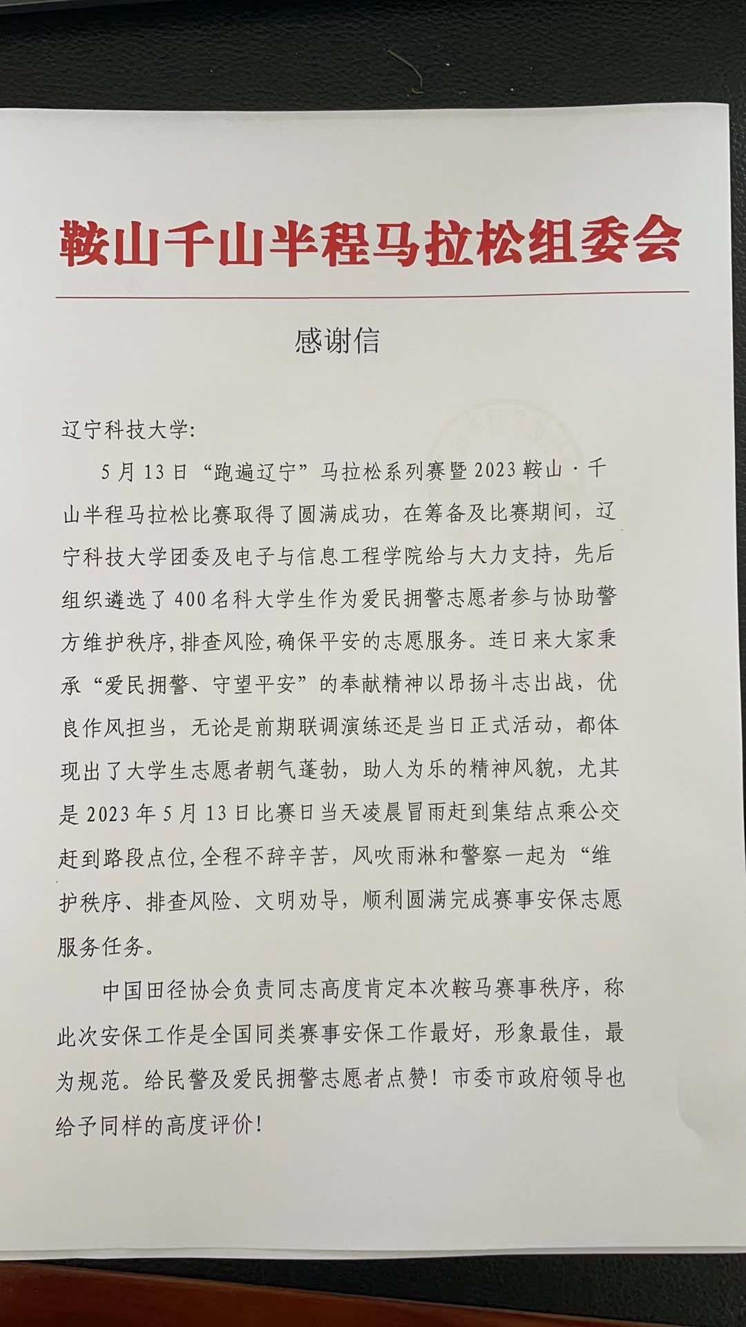 近日,乐动在线下载(中国)收到来自鞍山千山半程马拉松组委会的一封感谢信,由衷地感谢乐动在线下载(中国)团委及电子与信息工程学院给予“鞍马”赛事的大力支持,向乐动在线下载(中国)400余名青年志愿者对此次马拉松做出的卓越贡献致以最真诚的谢意。