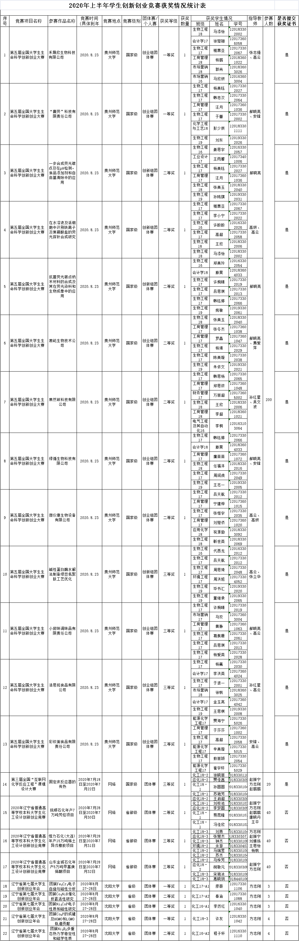 化工学院2020年上半年学生创新创业竞赛获奖情况统计表