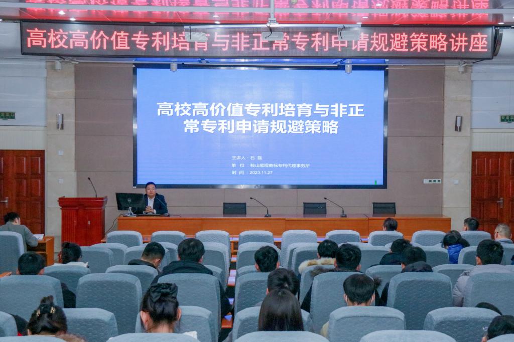 11月27日,科技处邀请辽宁科大顺程工业技术研究有限公司副总经理石磊为我校师生作题为《高校高价值专利培育与非正常专利申请规避策略》的讲座。