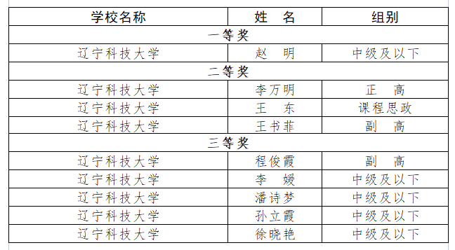 学校高度重视教师教学创新大赛,初赛阶段,认真组织开展校级教师教学创新大赛,精心推选9个教师(教学团队)参加省级复赛、决赛,并邀请校外专家从教学内容、理念与目标、过程与方法、评价与反馈、特色与展望等方面对入围教师(团队)进行“一对一”精细指导,反复打磨。在省赛中,来自全省60所高等院校的496个教师(教学团队)展开激烈比拼。最终,材料与冶金学院赵明获得一等奖,建筑与艺术学院王东、材料与冶金学院李万明、马克思主义学院王书菲获得二等奖,外国语学院潘诗梦、土木工程学院孙立霞、化学工程学院程俊霞、机械工程与自动化学院李媛、应用技术学院徐晓艳获得三等奖。