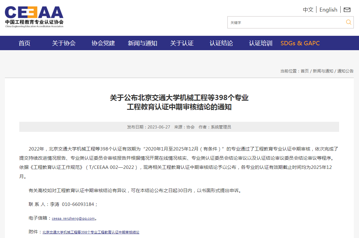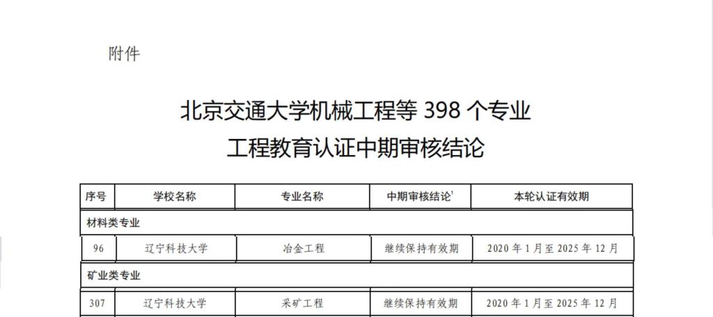 同期发布的《关于公布北京交通大学机械工程等398个专业工程教育认证中期审核结论的通知》显示,乐动在线下载(中国)材料与冶金学院的冶金工程、矿业工程学院的采矿工程共2个认证有效期为“2020年1月至2025年12月(有条件)”的专业,顺利通过工程教育专业认证中期审核,依次完成了提交持续改进情况报告、专业类认证委员会审核报告并根据情况开展在线情况核实、专业类认证委员会结论审议以及认证结论审议委员会结论审议等程序。