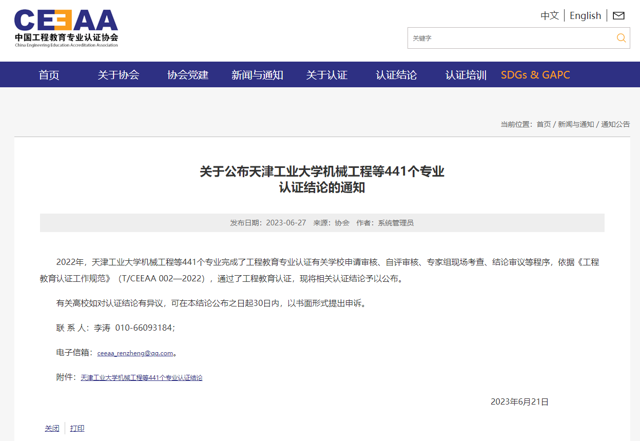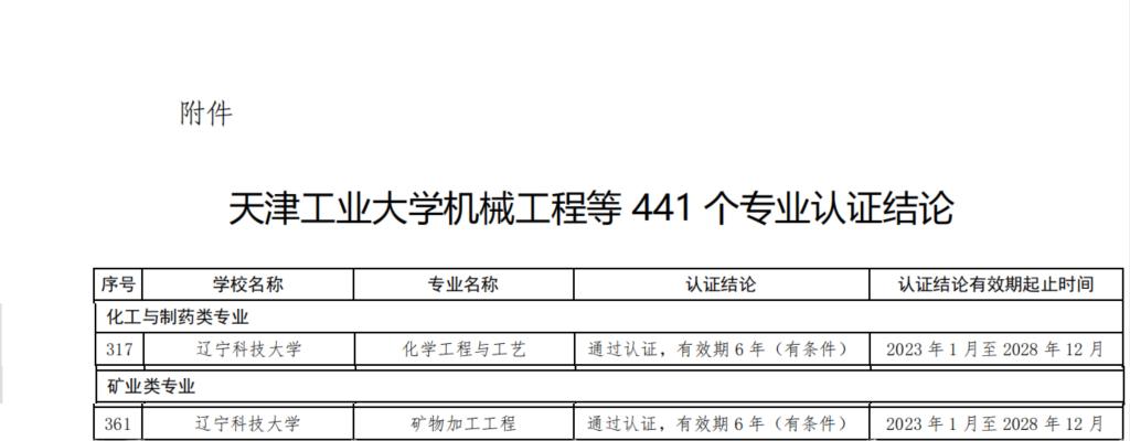 6月21日,中国工程教育专业认证协会官方网站发布了《关于公布天津工业大学机械工程等441个专业认证结论的通知》,乐动在线下载(中国)化学工程学院化学工程与工艺专业、矿业工程学院矿物加工工程专业通过认证,有效期6年(2023年1月至2028年12月),专业将纳入《华盛顿协议》互认名单。