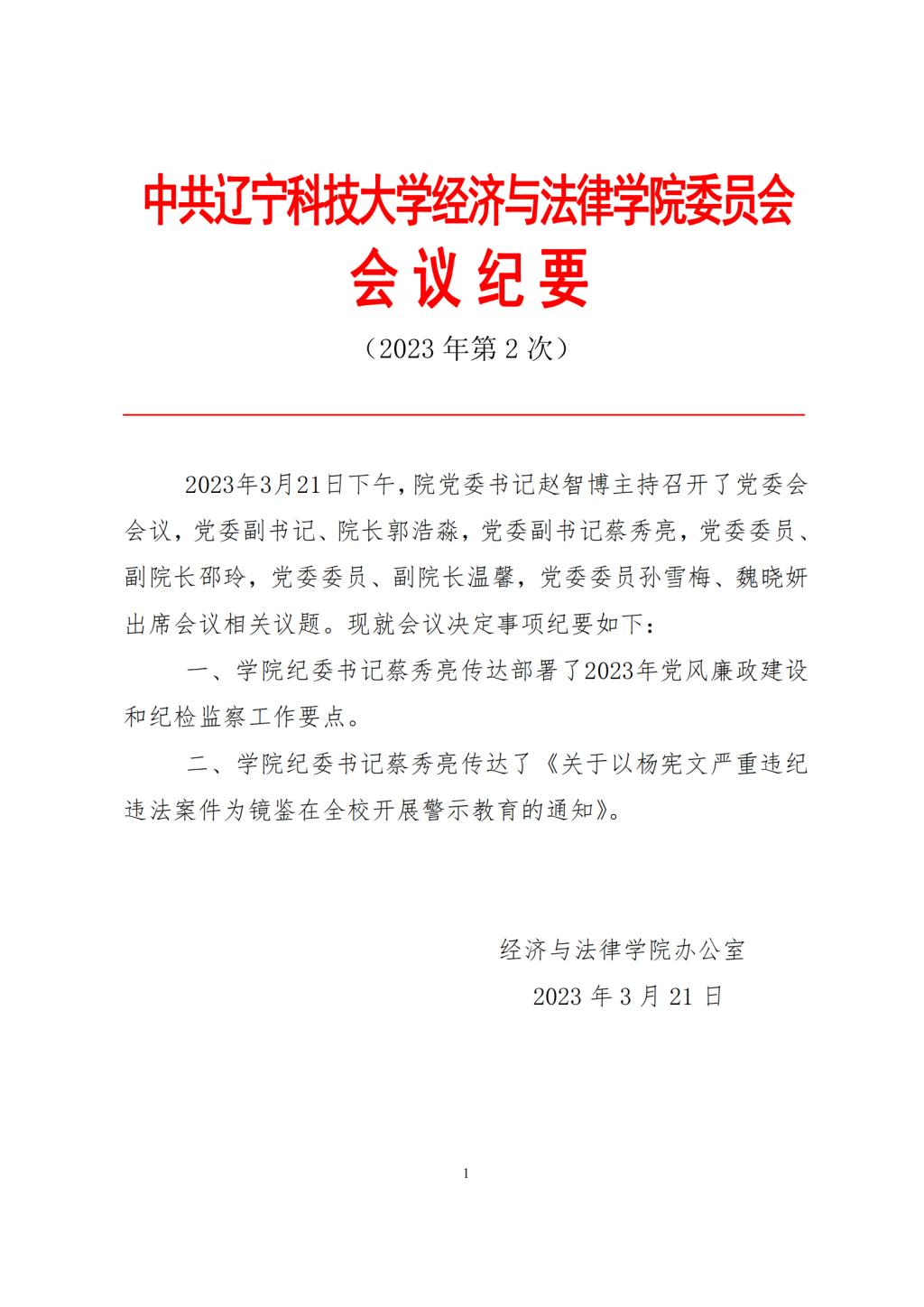 中共乐动在线下载(中国)经济与法律学院委员会会议纪要(2023年第2次)