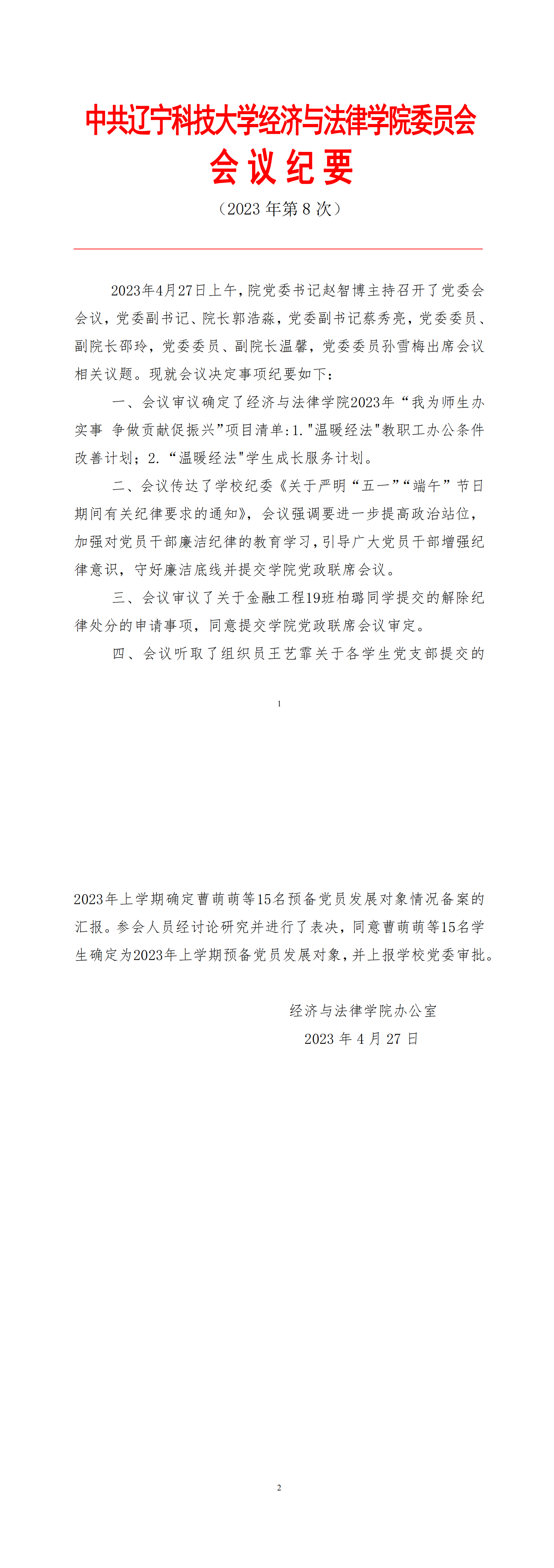 中共乐动在线下载(中国)经济与法律学院委员会会议纪要(2023年第8次)
