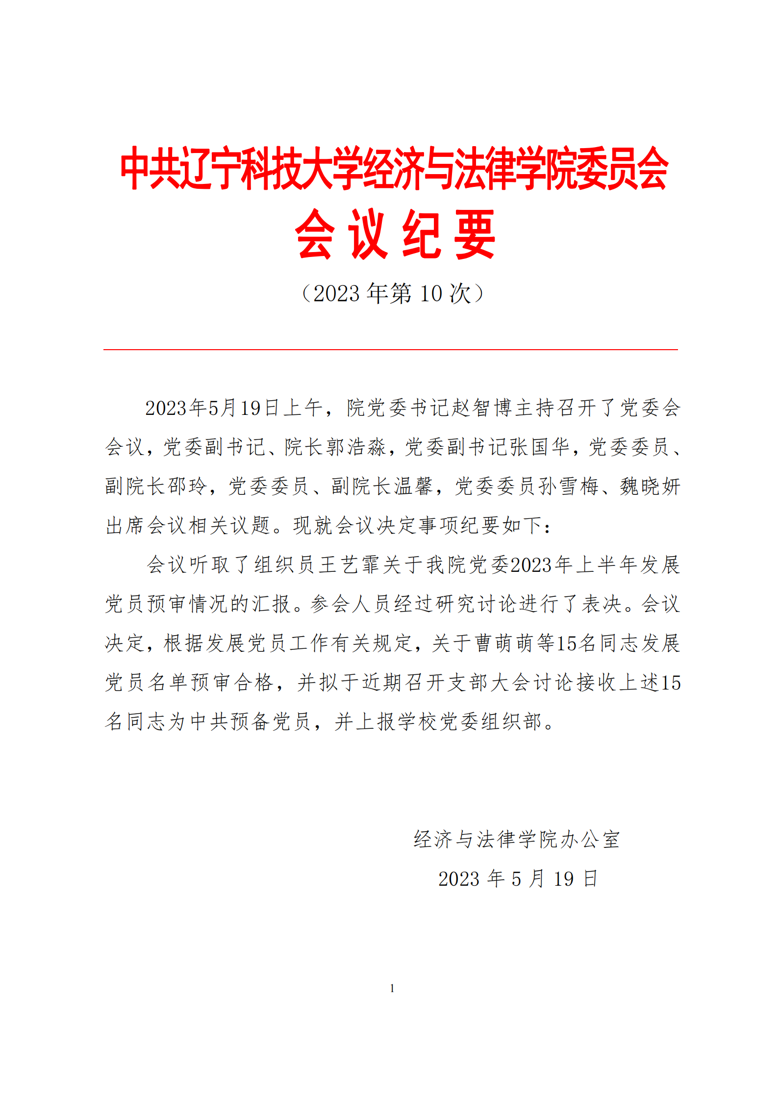 中共乐动在线下载(中国)经济与法律学院委员会会议纪要(2023年第10次)