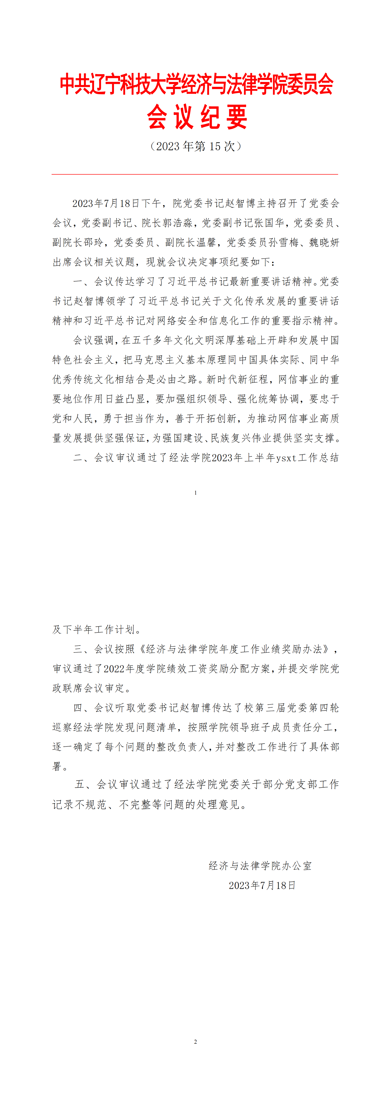 中共乐动在线下载(中国)经济与法律学院委员会会议纪要(2023年第15次)