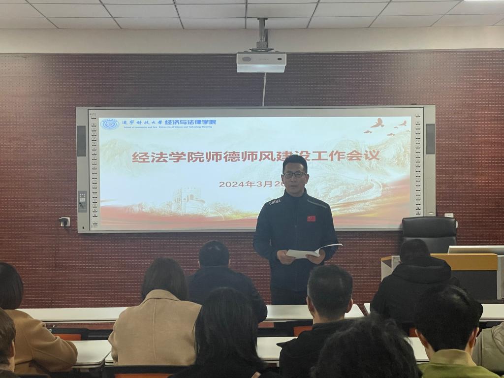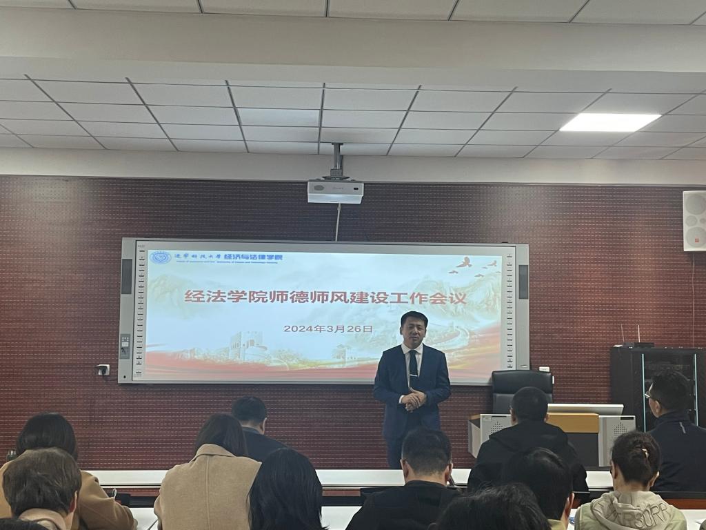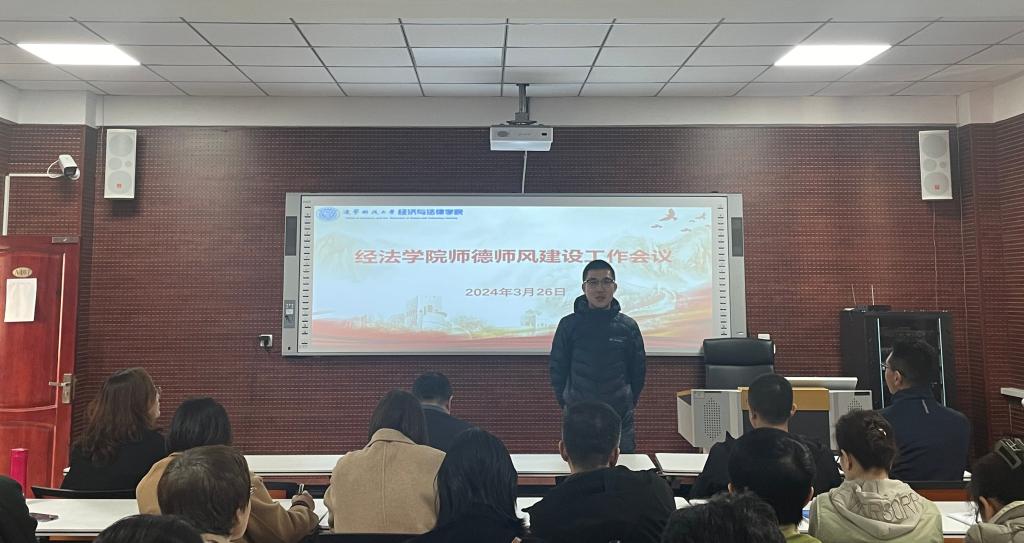 3月26日,经法学院在博识楼A407召开师德师风建设工作会议。会议由学院党委书记赵智博主持,学院全体教职工参加会议。