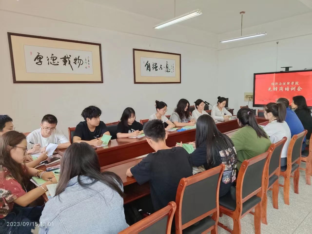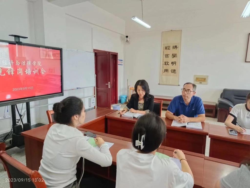 经法学院召开寝室先锋岗培训工作会为充分发挥寝室先锋岗的引领示范作用,推动先锋岗工作落实落地见成效,9月15日,经法学院于博识楼A313召开先锋岗培训会。学院党委副书记张国华、学办主任齐艳萍出席会议,2023级全体先锋岗成员参加。