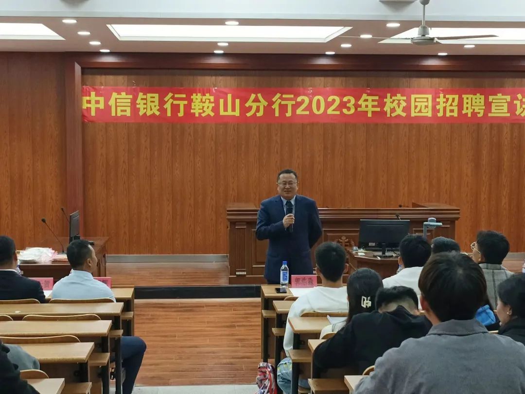 10月18日下午,经法学院邀请中信银行鞍山分行于明德楼A214开展校园招聘宣讲会。本次宣讲会由经法学院党委书记赵智博主持,中信银行鞍山分行一行6人、经法学院党政领导及辅导员5人出席会议,经法学院近100名2024届毕业生参会。