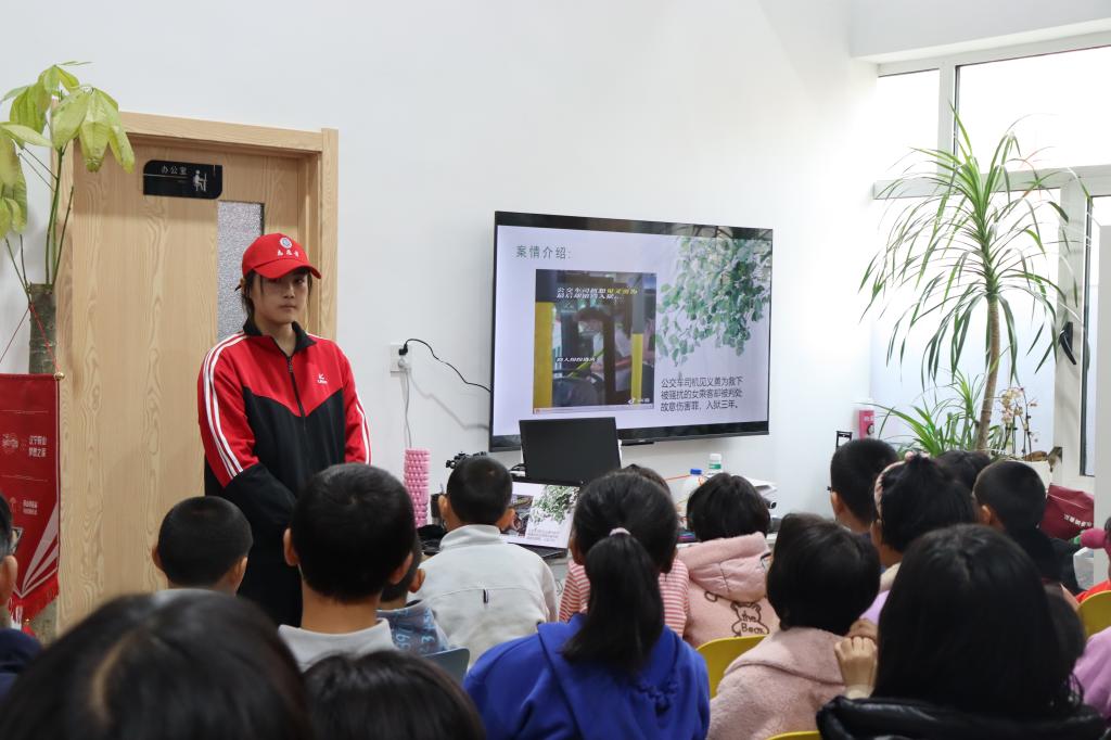 活动中,由经法学院法学专业的五名学生依次为“梦想之家”的孩子们进行了有关法律知识的宣传讲解,“小红帽”志愿者们通过近期热映的电影《第二十条》中根据真实案例改编的情节向在场孩子们讲述了相关法律知识,包括正当防卫的构成条件和界定标准、校园霸凌的表现形式和救济方法以及女性自我保护的重要性和保护途径等社会性问题,并对所举案例的法律依据在法条上的具体表述进行了总结,告诉孩子们“法不能向不法让步”,当合法权益受到侵害时,要勇敢地拿起法律武器保护自己。宣讲者们将案例中的知识点拓展出法律问题向孩子们进行提问,利用一问一答的形式加深孩子对法律知识的理解和消化,增加了互动性,得到了良好的宣传效果。活动最后,学院党委副书记张国华作总结发言,他表示,希望今天的普法宣传可以为孩子们今后的生活和学习带去帮助,在这个充满温情和爱意的大家庭里让法律的种子萌芽,同时也祝福孩子们怀揣着感恩之心走向未来的锦绣前程。