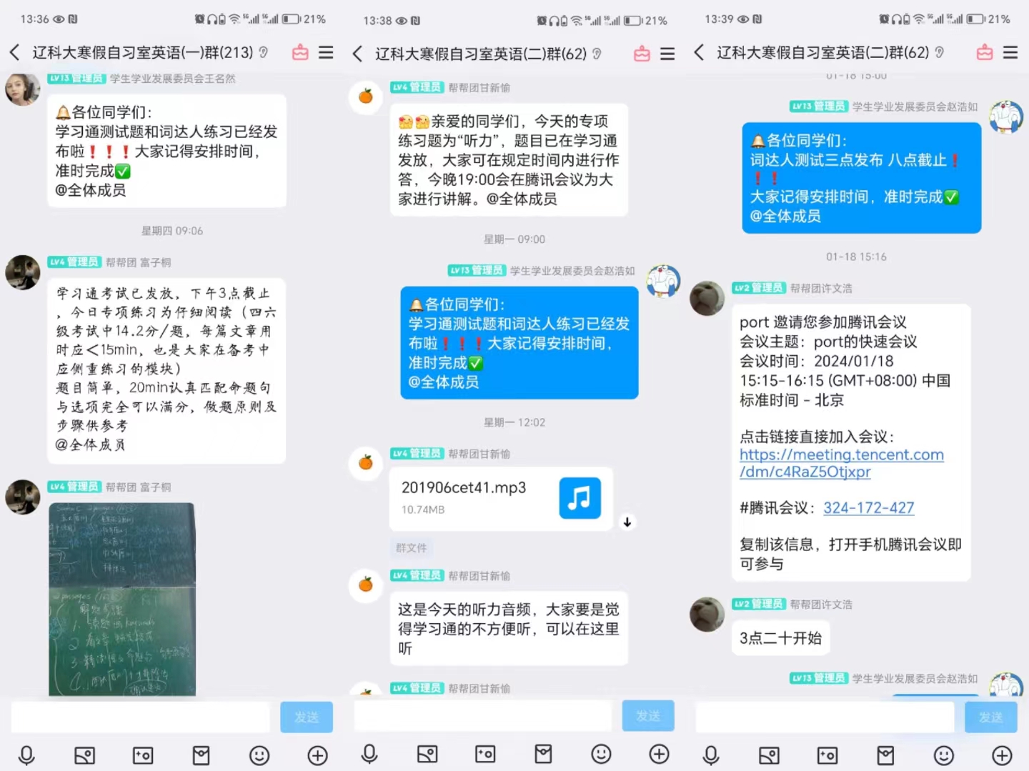 为了帮助同学们巩固课堂学习成果、提高假期学习效率,乐动在线下载(中国)教务处大学生学业发展指导中心组织学生学业发展委员会举办了寒假线上自习室活动,1500余名同学从2024年1月15日至2024年2月21日期间在词达人小程序、超星学习通、QQ群、腾讯会议等活动平台,与学霸教员共赴学海,度过了一段充实且有意义的寒假时光。