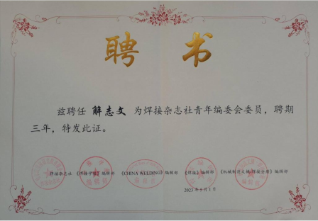 近日,《表面技术》《焊接杂志社》编辑部分别成立青年编辑委员会,我院解志文教授被聘青年编辑委员会委员