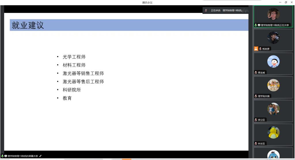 本次分享会邀请到就职于深圳先进电子材料国际创新研究院的校友陈凯为同学们分享经验。在分享会上,陈凯校友从就业形势和就业建议等两个方面做交流介绍。在就业形势上陈凯学长结合自身求职经历,认为目前专业就业面广阔,但是存在“杂而不精”的问题,导致就业相对薄弱。但是在专业交叉学科方面,他建议大家应当进行进一步的深造和提升。在就业建议上他推荐的领域有光学工程师、材料工程师、激光器售后服务师、科研院所和教育行业等方面。最后陈凯学长希望大家积极参加招聘会,丰富积累自己的经验,扩展自己的眼界,充实自己的素质,并送给物理专业毕业生诚挚的祝福和期待。