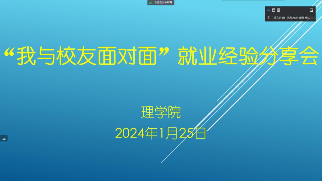 为加快推进2024届毕业生就业指导工作,为毕业生提供更好的就业指导服务,切实落实推进就业相关工作,理学院于1月25日晚召开光电信息科学与工程专业“校友面对面”就业经验分享会。会议由高宝威老师主持,院党委副书记侯立臣、团委书记宋薇老师、校友代表及光电专业2024届全体毕业生参加。