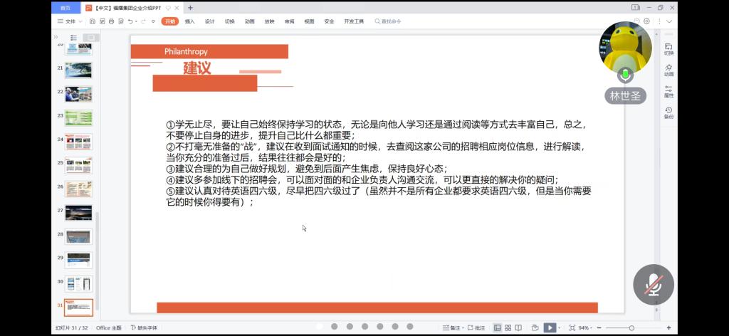 本次分享会邀请到就职于福耀玻璃工业集团股份有限公司23届光电专业校友林世圣为同学们作经验分享。林世圣从企业的基本情况、负责岗位职责、专业与工作衔接度和工作心得体会开展分享。一是学无止境,要让自己始终保持学习的状态,无论是向他人学习还是通过自学等方式进一步丰富自己,提高自身综合素质;二是做好充足准备,他建议大家在收到面试通知的时候,去查阅这家公司的招聘相应岗位信息,并进行详细解读,提升面试成功概率,积累面试经验;三是建议合理地为自己做好规划,避免毕业前因待就业而产生焦虑,保持良好心态;四是建议多参加线下的招聘会,可以面对面地和企业负责人沟通交流,可以更直接地解决就业疑问。