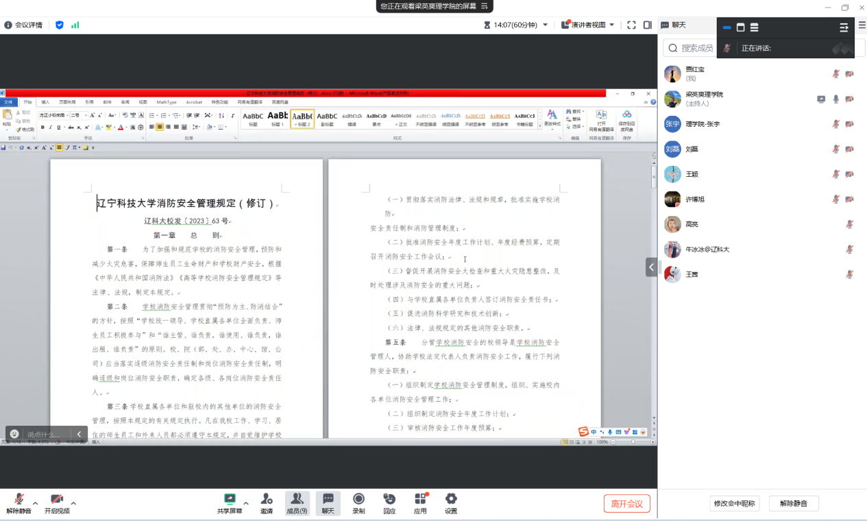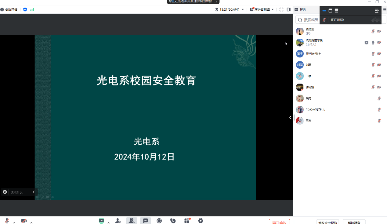 2024年10月12日晚,理学院光电系举办线上“光电系校园安全教育”活动,由光电系副主任梁英爽主持会议,光电系全体教师参加了此次会议。