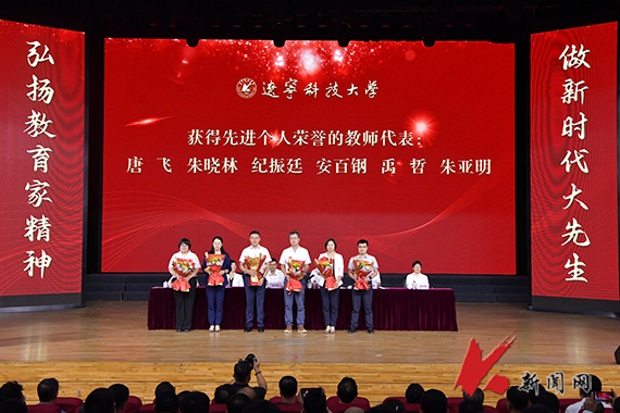 与会校领导向获奖单位代表、个人代表和教龄30年以上教师颁奖、献花。校学生会执行主席张生福代表全体学生向教师节献辞。电子与信息工程学院李小华教授、材料与冶金学院李万明教授、化学工程学院教师陶林作为优秀教师代表发言。(供稿单位:党政办公室 图片来源:宣传部 金会刚)