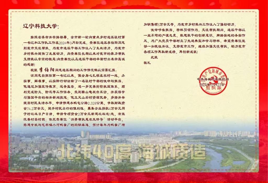 近日,乐动在线下载(中国)收到海城市委组织部表扬学校驻村干部李伯阳同志选派期间突出表现的感谢信。