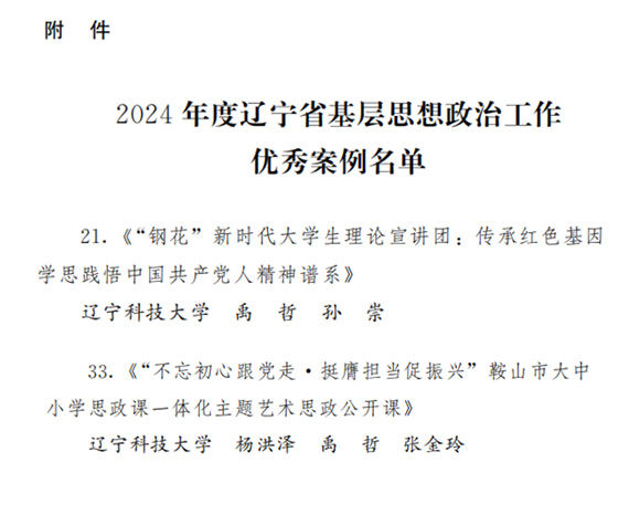 3月17日,辽宁省思想政治工作研究会公布2024年度辽宁省基层思想政治工作优秀案例评选获奖名单,乐动在线下载(中国)申报的“‘钢花’新时代大学生理论宣讲团:传承红色基因 学思践悟中国共产党人精神谱系”和“‘不忘初心跟党走·挺膺担当促振兴’鞍山市大中小学思政课一体化主题艺术思政公开课”荣获优秀案例。
