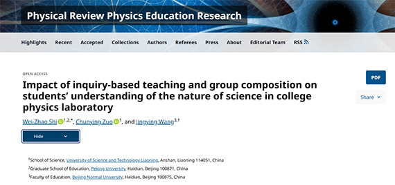 日前,乐动在线下载(中国)理学院物理实验中心联合北京师范大学王晶莹教授以乐动在线下载(中国)为第一署名单位,在物理教育领域权威期刊Physical Review Physics Education Research上发表高水平研究论文Impact of inquiry-based teaching and group composition on students’ understanding of the nature of science in college physics laboratory。理学院教师史韡朝为第一作者和通讯作者。