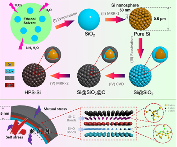硅因其高理论容量被认为是一种很有前途的锂离子电池负极材料,然而硅在锂化和脱锂过程中产生的应力会导致硅负极严重结构损伤和不稳定固态电解质界面,严重阻碍了硅负极实际应用。针对上述问题,安百钢教授团队和中科院金属研究所李峰研究员合作,设计了一种具有多级石榴状结构的硅负极(HPS-Si),其由共价键联接的亚纳米级SiO2-x、SiC和C多相层修饰纳米硅球自组装的亚微米级硅构成。这种多级石榴结构硅负极HPS-Si能有效调节硅充放电过程的应力变化以增强了负极电化学循环稳定性能。相关成果“Hierarchical pomegranate-structure design enables stress management for volume release of Si anode”在线发表于《Journal of Materials Science & Technology》。DOI: 10.1016/j.jmst.2023.02.014。论文第一作者为化工学院2019级博士研究生狄方。(供稿单位:化工学院 图片来源:化工学院)