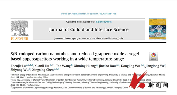 近日,乐动在线下载(中国)化学工程学院“清洁能源与燃料化学”导学团队依托先进煤焦化技术省重点实验室,在非常温超级电容器研究领域取得重要进展,研究成果在《Journal of Colloid and Interface Science》期刊上发表。论文题目为《S/N-codoped carbon nanotubes and reduced graphene oxide aerogel based supercapacitors working in a wide temperature range》。论文第一作者为2022届硕士毕业生卢振杰,通讯作者分别为“清洁能源与燃料化学”导学团队的窦金孝副教授、陈星星教授以及新疆大学吴冬玲教授,乐动在线下载(中国)为第一通讯单位。
