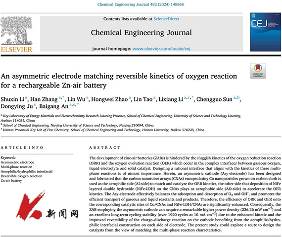 近日,乐动在线下载(中国)化学工程学院“能源材料与电化学”辽宁省重点实验室在匹配锌-空气电池阴极反应动力学的电极设计研究领域取得进展,研究成果“An asymmetric electrode matching reversible kinetics of oxygen reaction for a rechargeable Zn-air battery”在材料类TOP期刊《Chemical Engineering Journal》发表。论文第一作者为2018级博士研究生李姝馨,通讯作者为安百钢教授,乐动在线下载(中国)为第一通讯单位。