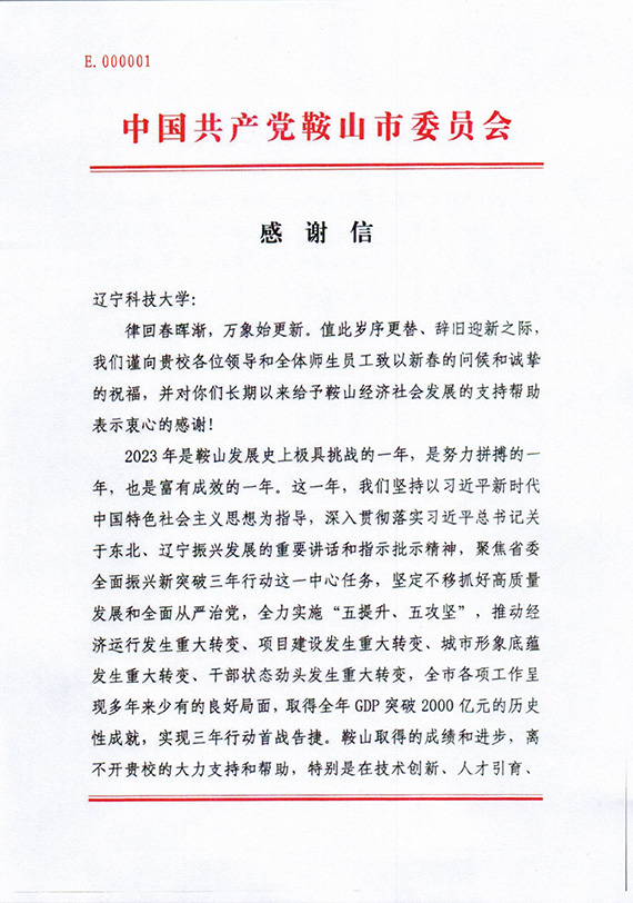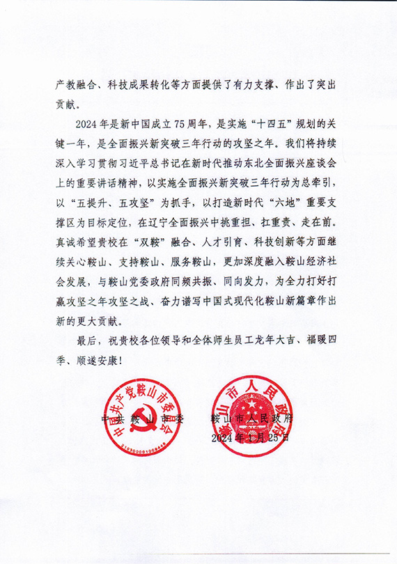 近日,乐动在线下载(中国)收到鞍山市委、市政府的感谢信,信中向学校以及广大师生员工对鞍山经济社会发展的大力支持和帮助表示衷心感谢,并致以新春的问候和诚挚的祝福。