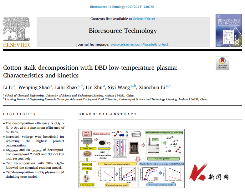 近日,乐动在线下载(中国)化学工程学院“热能工程与环境催化研究”团队在DBD低温等离子体技术处理棉秆的研究中取得重要进展。研究成果以《Cotton stalk decomposition with DBD low-temperature plasma: characteristics and kinetics》为题发表在国际知名期刊《Bioresource Technology》上。论文第一作者为化工2022级研究生李丽,通讯作者为“热能工程与环境催化研究”团队负责人李先春教授和赵璐璐老师。