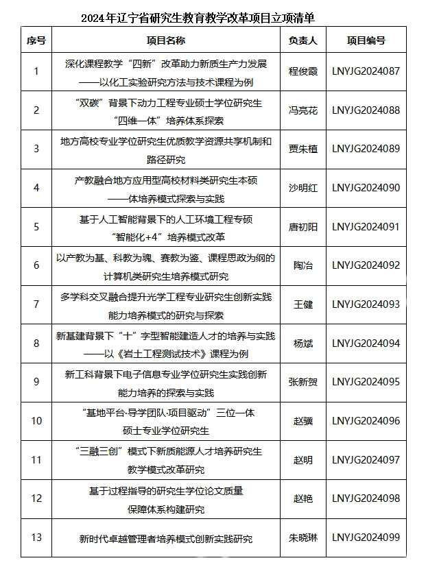 近日,从辽宁省教育厅学位管理与研究生教育处发布的《关于确定2024年度辽宁省研究生教育教学改革研究项目立项的通知》中获悉,乐动在线下载(中国)获批13项研究生教育教学改革研究项目,获批项目涵盖多个学科领域和研究方向。