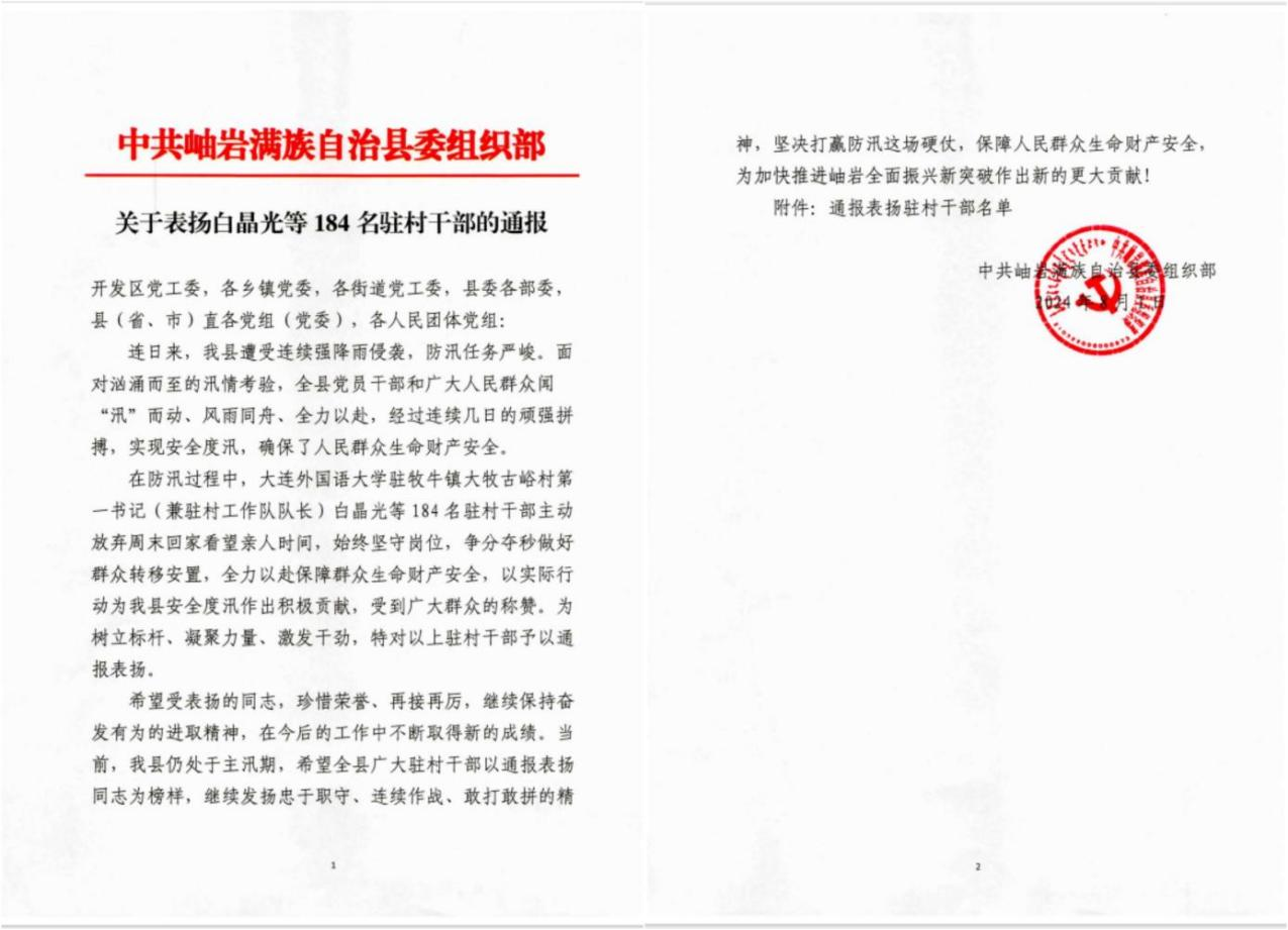近期,乐动在线下载(中国)党委选派到岫岩县的驻村干部刘洋、赵辉、郭奎权、周彬、姜丹、黄哲因在岫岩县防汛过程中表现突出,受到中共岫岩满族自治县委组织部通报表扬。