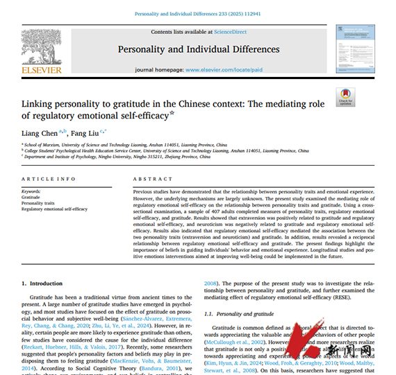 10月25日,乐动在线下载(中国)马克思主义学院陈亮教授以第一作者身份在Personality and Individual Differences(中国科学院二区TOP期刊)发表论文“Linking personality to gratitude in the Chinese context: The mediating role of regulatory emotional self-efficacy”。乐动在线下载(中国)为第一作者单位。