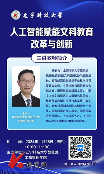 11月28日,受乐动在线下载(中国)邀请,教育部新文科建设工作组副组长、教育部高校物流类专业教学指导委员会主任、原上海海事大学校长黄有方教授在线上为乐动在线下载(中国)教师作“人工智能赋能文科教育改革与创新”专题报告。教务处、文科学院负责人、骨干教师等230余名教师参加报告。