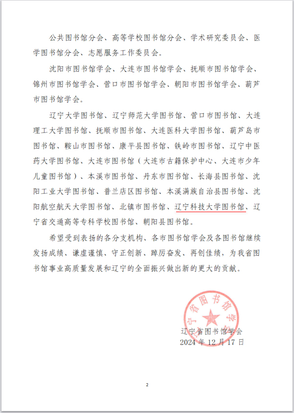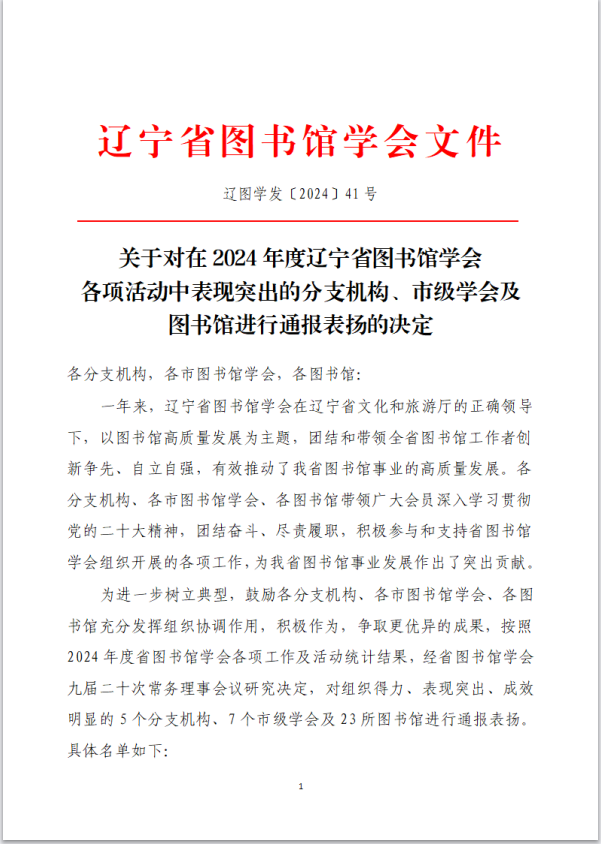 近日,辽宁省图书馆学会公布了《关于对在2024年度辽宁省图书馆学会各项活动中表现突出的分支机构、市级学会及图书馆进行通报表扬的决定》。乐动在线下载(中国)图书馆凭借在2024年度的突出表现和积极贡献,获得通报表扬。