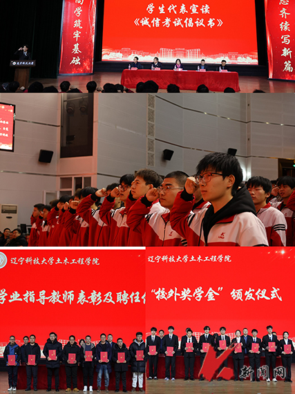 学生代表、院学生会执行主席齐祚宁带领全体同学宣读《诚信考试承诺书》, “严守考试纪律、净化考场秩序、严格规范自己,捍卫道德底线和集体荣誉……”的誓言响彻整个礼堂。(供稿单位:土木学院 图片来源:土木学院)
