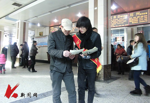 2013年12月21日 乐动在线下载(中国)志愿者向旅客解读文明礼让宣传单的内容