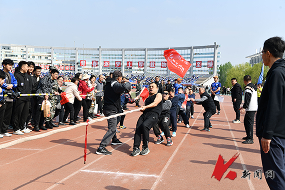 他们凝神聚力,紧握长绳,压低重心,双脚蹬地,竭尽全力,拔河赛场上,为了获胜的目标齐心协力。