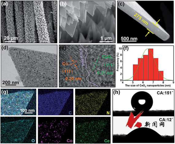 2/Co异质结构修饰的氮掺杂多孔碳纳米片阵列垂直生长在碳布上的集成阴极。该材料独特的优势在于,首先,垂直生长在碳布上的氮掺杂多孔碳纳米片阵列电极不仅可以在不使用任何导电剂、粘合剂的情况下,直接在集流体与催化剂之间进行快速的电子转移和质量传递,而且纳米片阵列结构改善了原始碳布浸润性,避免了制备过程中的团聚现象,进而使活性位点更容易介入,增强了活性位点利用率。其次,构建CeO