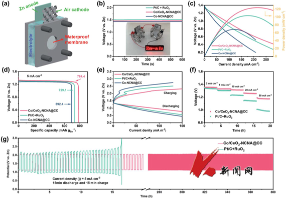 可充电锌-空气电池具有能量密度高、安全性好、环境友好等优点,被认为是一种很有前途的储能装置。然而,非贵金属催化剂在改善锌-空气阴极缓慢的氧反应动力学方面仍面临挑战。为了解决这一问题,该研究以金属-有机框架(MOF)为前驱体,采用碳化-水解过程,构建了CeO