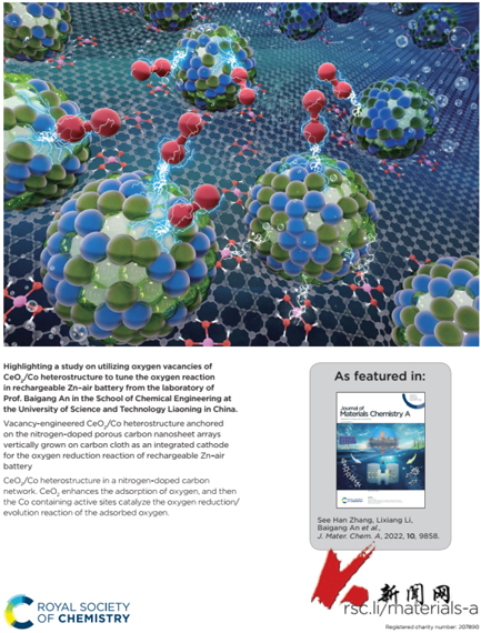 近日,乐动在线下载(中国)化工学院“能源材料与电化学”辽宁省重点实验室在合成锌-空气电池阴极催化剂领域取得重要进展,研究成果在材料类TOP期刊《Journal of Materials Chemistry A》(IF=12.73)以封面论文 (Inside cover paper) 发表题为 “Vacancy-engineered CeO