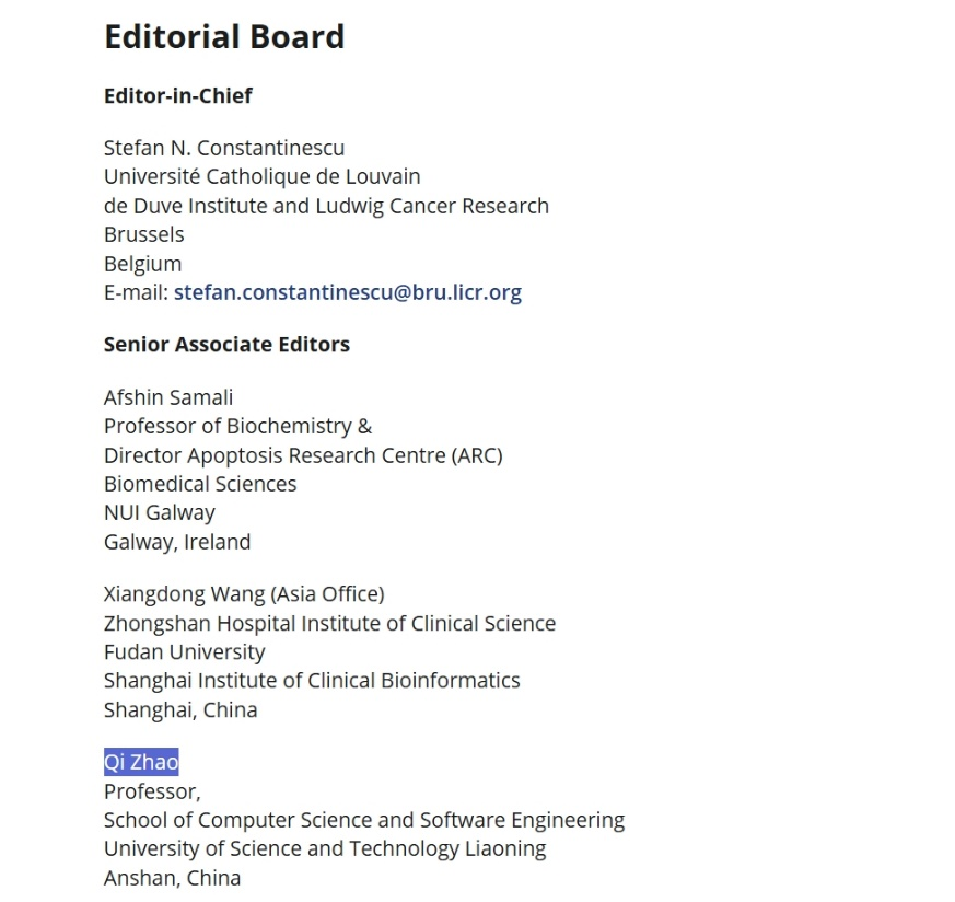 近日,乐动在线下载(中国)计算机与软件工程学院赵琪教授收到比利时皇家医学科学院院士、罗马尼亚科学院院士、欧洲医学科学院联合会副会长、比利时鲁汶大学Stefan Constantinescu教授邀请,受邀担任威立出版集团旗下期刊Journal of Cellular and Molecular Medicine高级副主编(senior associate editor)。该期刊的高级副主编共有三人,另外两位分别是欧洲人文和自然科学院院士、复旦大学特聘教授王向东,爱尔兰国立高威大学资深教授Afshin Samali。